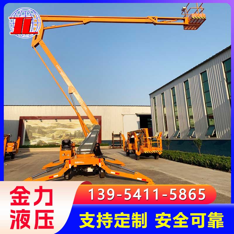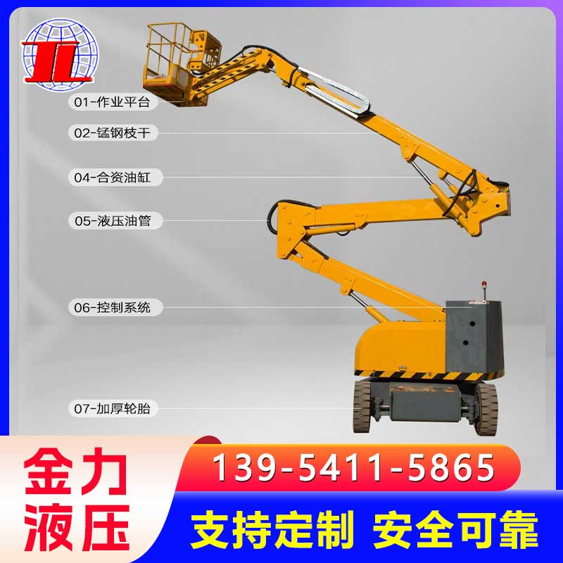 一种利用汽车引擎动力驱动的折臂式高空作业车。车辆的行走功能,使升降平台有更好的灵活性和机动性,使高空作业效率更高。折臂结构紧凑,采用新型型钢,强度高,重量轻,架设速度快,工作台既可升高又可水平延伸,还可旋转360度,易于跨越障碍到达工作位置。